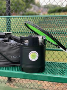 ORDER THE PERSONAL T.B.R. NOW (less than 12″ tall, less than 9″ wide and weighs less than 9 lbs when filled with 20 tennis balls)(racquet not included; just there for comparison)