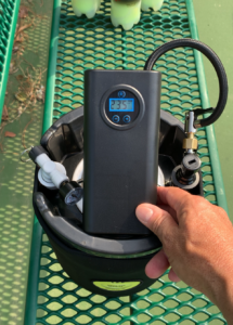 We have a RECHARGEABLE AIR PUMP. It has a digital readout and allows you to set the PSI at .5 lb increments. This means you can set it to 22.0 lbs or 22.5 lbs, etc. so that when the tank reaches that level the pump will automatically shut down.